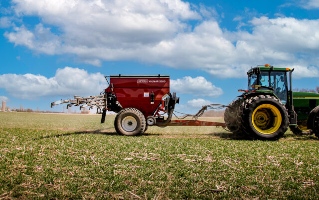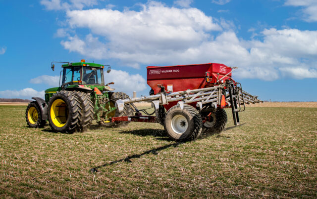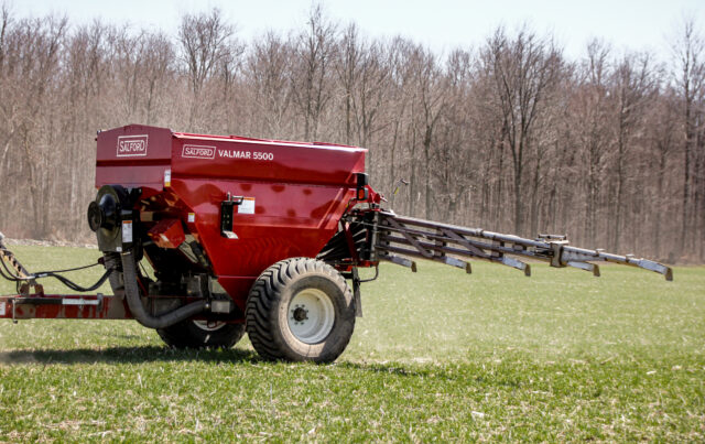 With an optional kit, the 5500 can accurately apply small seeds or herbicide at low rates, something that is not possible with a spinner-type spreader. The kit consists of two 28-groove metering rollers and a fan intake reducer allowing for low application rates of 5 pounds per acre when needed.