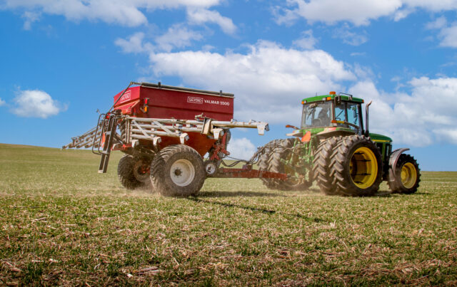 The ground-driven mechanical gearbox uses 60 different gear ratios for metering rates at 5% increments. Rates as low as 5 pounds per acre for herbicide application and as high as 500 pounds of fertilizer per acre at 5 miles per hour.