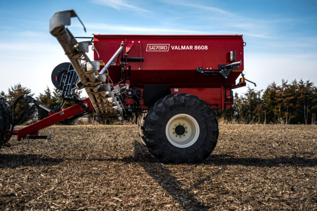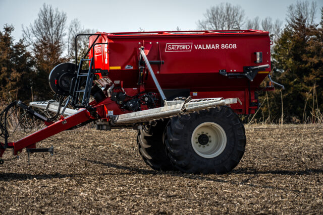 Salford’s Valmar 8600 is a high capacity, high speed, air boom applicator capable of delivering up to 1,000 lbs./acre at 8 mph. The 8600 has up to 11-ton capacity and features adjustable axles to accommodate most row spacings. The 8600’s metering can be mechanically, or hydraulically driven for straight rate, or variable rate application. The ground driven metering system is extremely accurate, automatically adjusting to ensure a uniform application rate regardless of ground speed. This machine is equipped with a simple to calibrate and highly accurate Venturi metering system that makes it easy for anyone to operate.