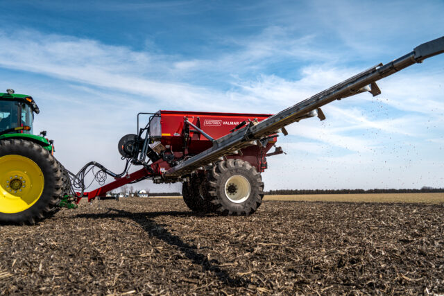 The Valmar 8600 can be configured with a ground-driven or hydraulic metering system. The ground-driven system uses an accurate 60-speed gearbox. which allows for rate adjustments in 5% increments for precise application with a wide variety of granular products. Left/right metering section control can be manually operated from the cab to minimize overlap throughout the field. The hydraulic-driven metering system option can automate the left/right hand control and allows for variable rate application using ISOBUS control through a third-party rate controller.