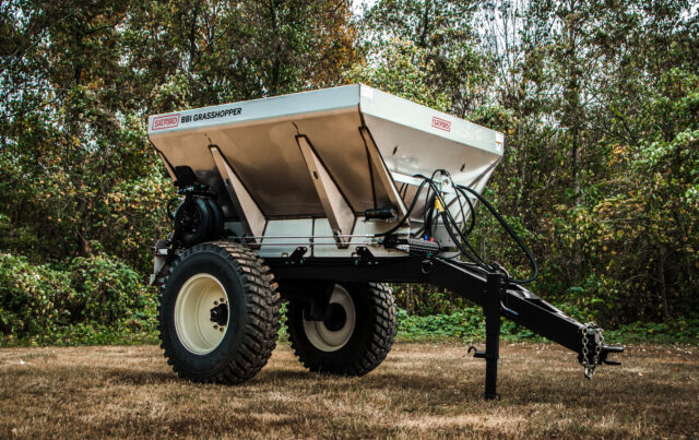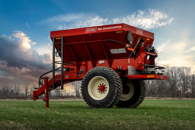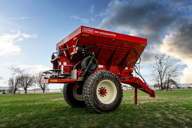 The Grasshopper pull-type spreader is the original mid-season, top-dress applicator from Salford. Designed to hold 5 tons of fertilizer or 7 tons of lime, this machine delivers the nutrients your emergent crop needs to maximize yield potential. With high ground-clearance for row cropping and top dressing and flotation tires to minimizing soil compaction, this spreader achieves precision application in both row crop and sod/turf farm environments. The Grasshopper is built for durability and precision, featuring ground-wheel-drive mechanics, and the original Salford spreader system for a consistently wider, flatter spread pattern.