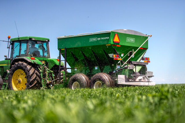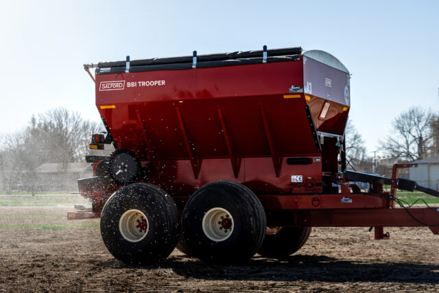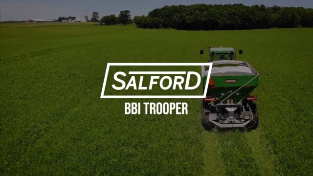Designed for fleets, Salford’s BBI Trooper pull-type spreader is an easy-to-operate fertilizer applicator for precision application and towing between fields. Built for durability, this machine has a 10-foot hopper and is ready to spread fertilizer on small and medium-sized farms. The Trooper spreader is capable of spreading granular fertilizer up to 60 feet with the PTO driven spinner system and up to 80 feet with the hydraulic spinner option. Both options deliver a consistently wide, flat spread pattern. The mechanical, ground-wheel-drive design is matched with Salford precision and flotation tires to reduce soil compaction, making this applicator ideal for a variety of settings, from row crops to sod and turf farms.