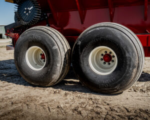 The BBI Trooper uses 10,000 lbs. torsion axles with 21.5L X 16.1 Flotation tires, 8-bolt hubs which is standard on all Trooper machines. The axle system provides better in field stability, particularly in uneven ground conditions and the tandem flotation tires help to reduce compaction and increase crop yields.